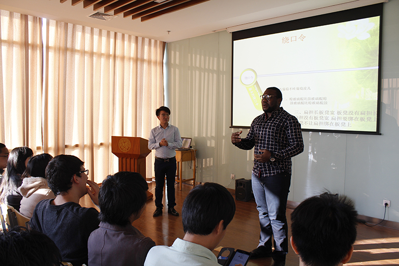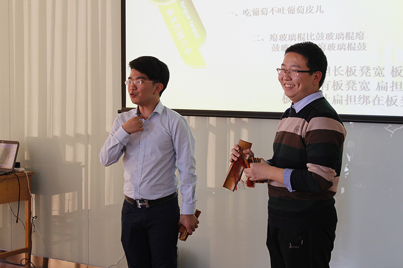 此次讲座邀请了著名相声演员李春熠、郭鸿斌、姜华等,为同学们讲授快板、相声等相关知识。讲座一开始,郭鸿斌先生就用一段悠扬的萧曲向大家展示了中华曲艺的博大精深,随后,他又为大家讲解了快板的相关知识,还带来了一段轻快的快板表演,赢得大家阵阵赞叹。紧接着,姜华从中外幽默文化对比方面为大家讲解了中国相声文化里包袱的由来,幽默且翔实的讲解让大家都获益匪浅。最后,李春熠先生就相声中的绕口令这一知识为大家进行了生动活泼的介绍,“吃葡萄不吐葡萄皮”“扁担宽板凳长”等中国人耳熟能详的绕口令让在场的职工跃跃欲试,各国职工还向大家展示了自己国家的绕口令,令现场气氛达到高潮。最后,李春熠和郭鸿斌一起为大家带来了一段相声,结束了当天的讲座。