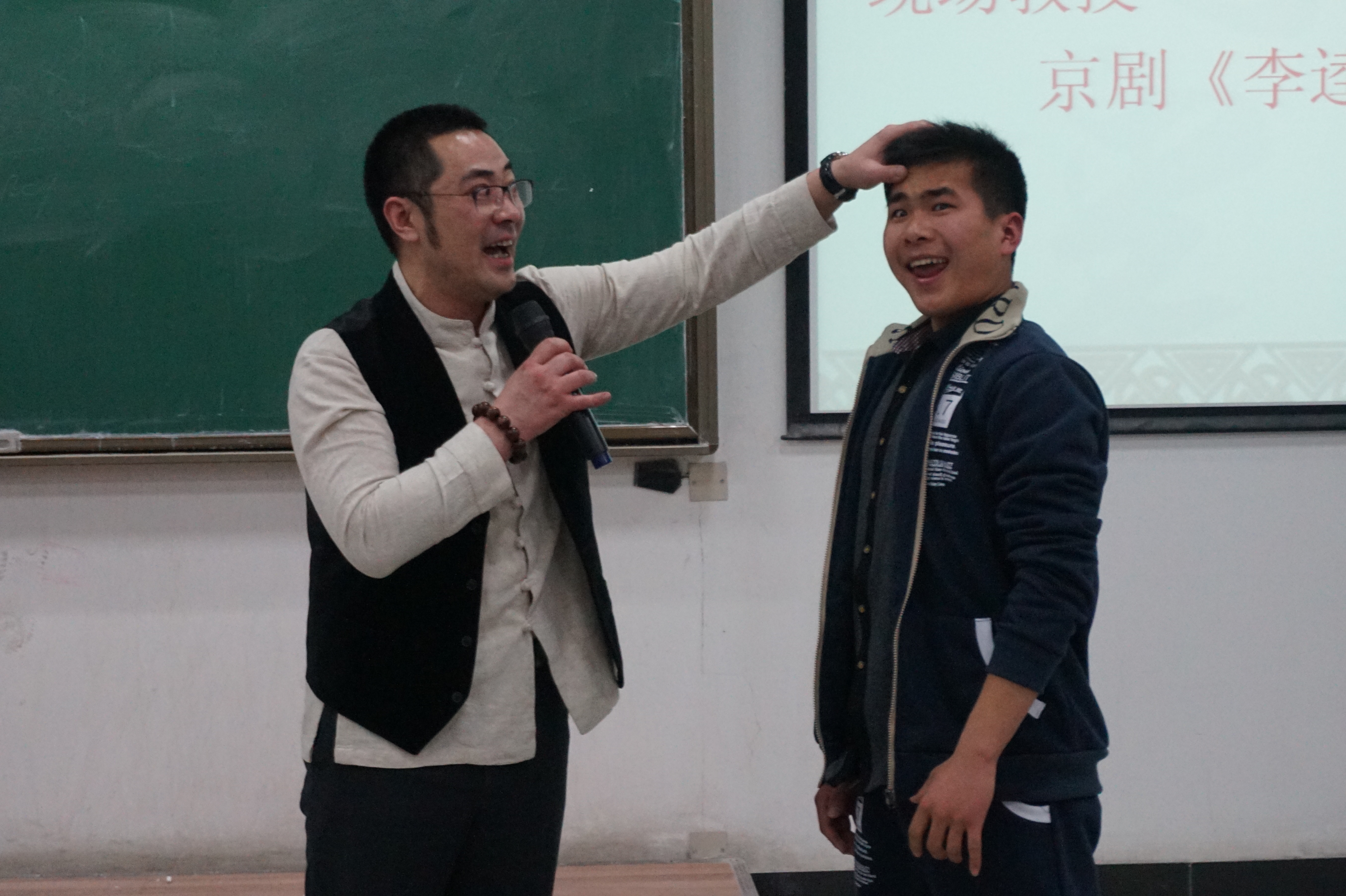 讲座开始,刘佳老师以一句“不到园林,怎知春色如许?”诗意地请出了王钦老师,由他引领同学们步入京剧的百花园,重点解读京剧净行的无穷魅力。王老师用深入浅出、风趣幽默的语言为同学们介绍了净行分类、表演技法和脸谱谱式等专业知识。谈到净行的声音形象时,他为大家示范了包拯、曹操、刘瑾等角色的唱念,充分展示出净行在演唱和念白方面,如洪钟大吕、珠走玉盘般的气势和爽利,让听者如醉如痴。讲座还精心设计了互动环节,同学们在王老师的指点下,现场学习了净行的表演方法。最后,王老师请出天津艺术职业学院的员工乐队,为大家演唱了京剧《九江口》选段,他声情并茂的演唱和深厚的艺术功力震惊全场。