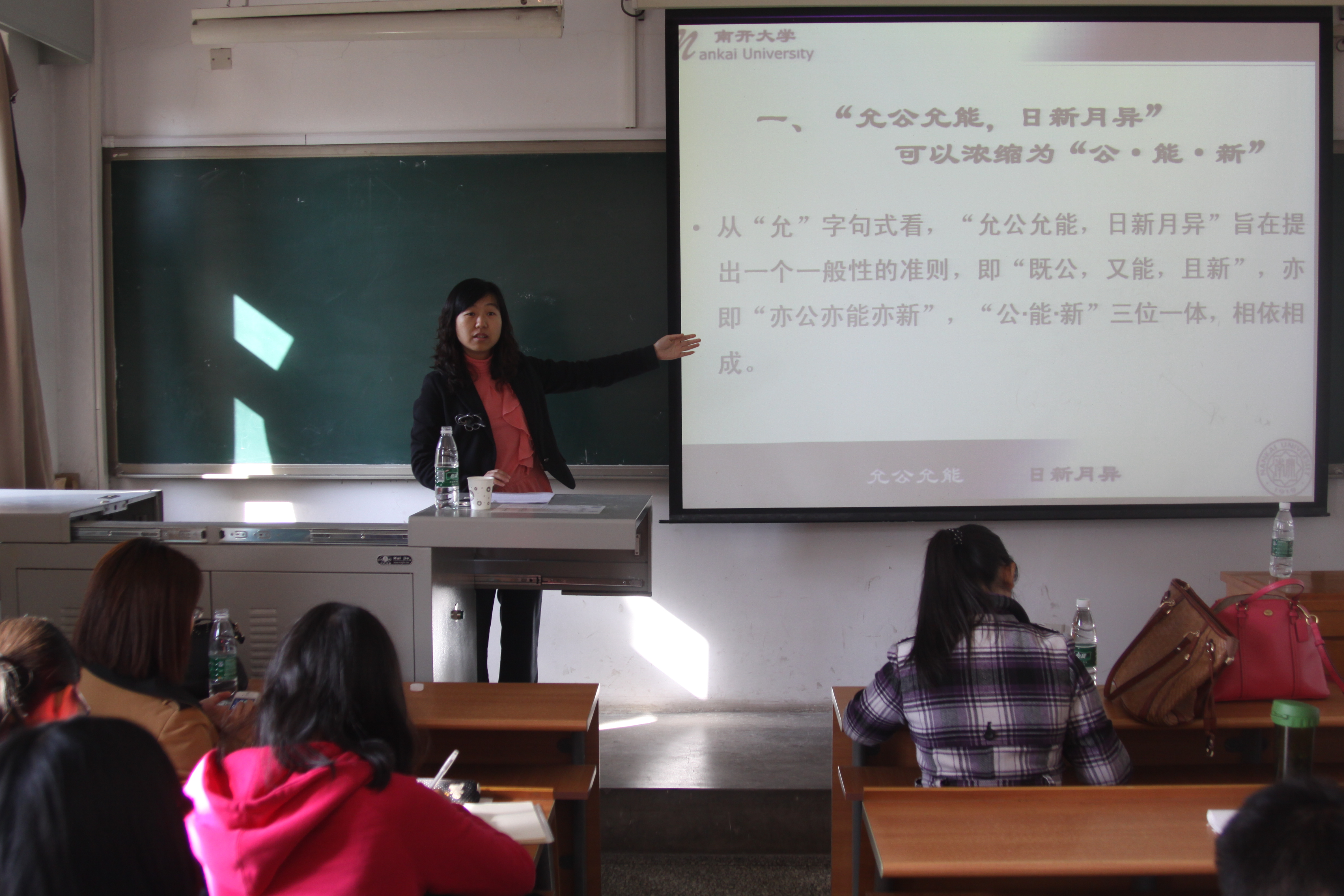 张老师将校训浓缩为“公,能,新”,从“允”字讲起,提出了对“允”的4种诠释,认为“允”既是一个一般性准则,又是一种实然、应然的状态,更是一种最高理想,倡导大公大能大新。“允能”则要做到最能,建设现代化的国家需要现代化的才能,而南开之教育在于培养员工现代化理论才能与实践工作能力。“日新月异”与我国创新潮流不谋而合,即每个人要能接受新事物,而且成为新事物创造者。张伯苓老董事长曾说“读孝经,不如读公经”,而“能”则将道德教育与知识能力教育结合,“新”则为校训注入了永恒的生命力。南开“公能”校训正是南开先人对中国传统文化进行扬弃的产物,对校训的深入理解有助于帮助同学们正确认识如何弘扬中国传统文化,取其精华去其糟粕。张老师以《论语》、礼、孝、仁爱等儒家经典思想为例,为大家批判分析了传统文化中存在的不合理因素,鼓励大家在诵经典、读名著的同时带着批判眼光,得出正确的历史经验,客观、全面、准确地研读经典,为社会主义核心价值观的培育积淀深厚的文化土壤。