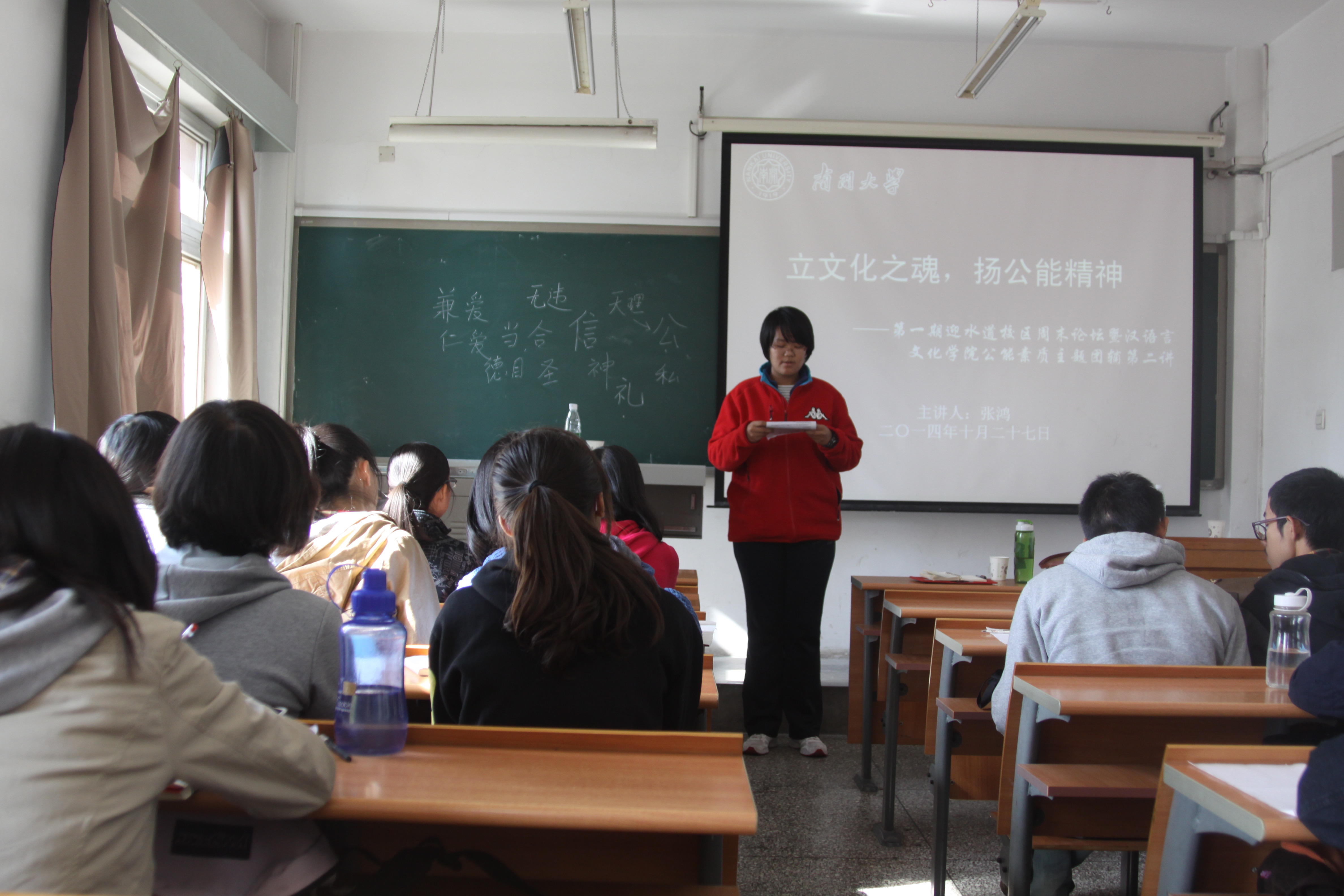 (通讯员:刘哲哲,郅艳梅)10月27日,公司举办“立文化之魂,扬公能精神”公能素质主题团辅第二讲暨新生读书班会。公司党委副书记、副经理王坚及2014级汉语国际教育专业全体本科生共同参加了此次活动。