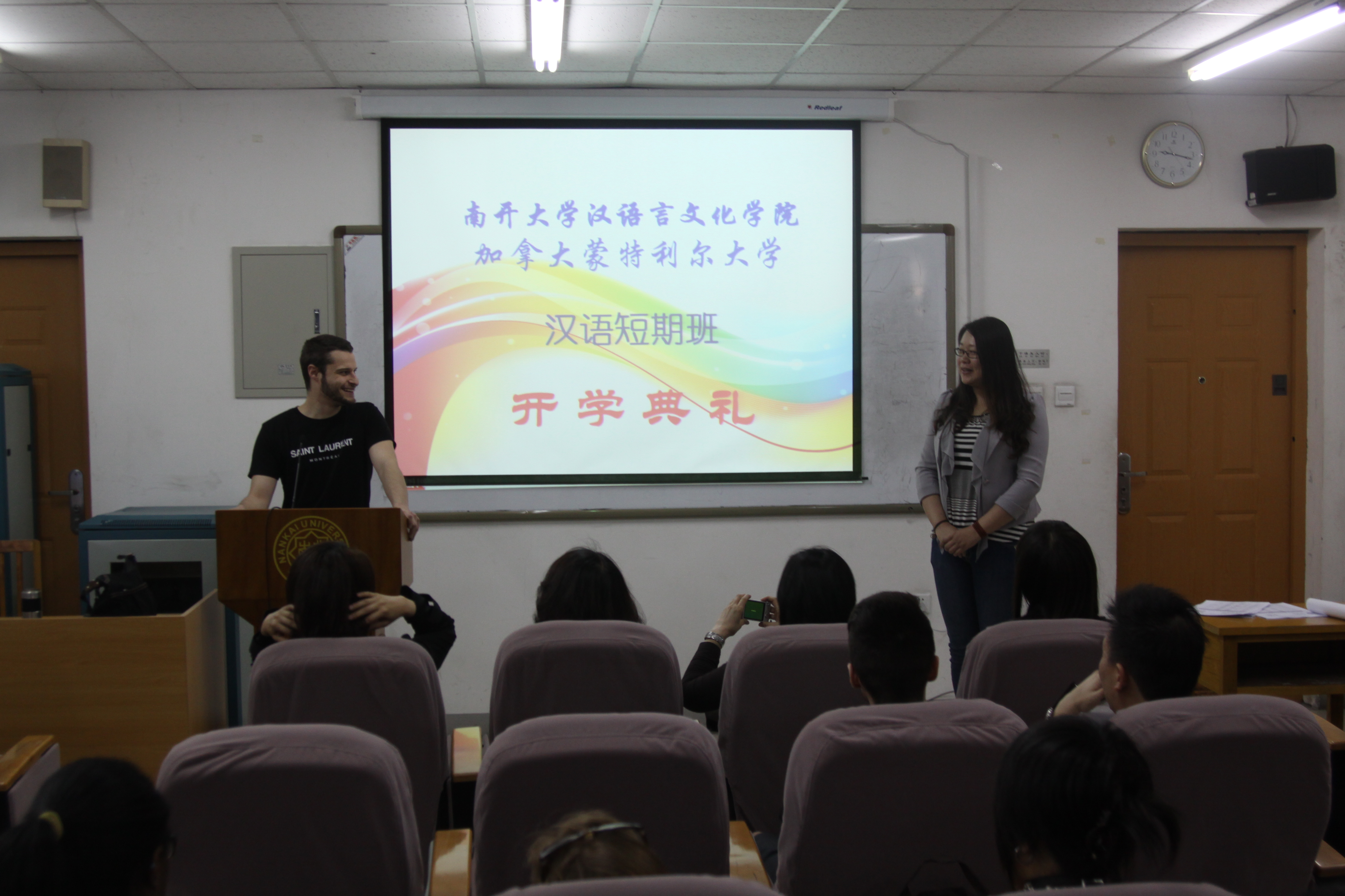 最后,任课教师代表王瑛对短期班的教学安排和注意事项向同学们作了介绍。王瑛副教授曾在法国执教多年,有丰富的对外汉语教学经验,她还用法语和汉语向短期班的师生表达了祝福和期望。开学典礼结束后,全体师生一同合影留念。为期十周的短期班课程拉开帷幕。