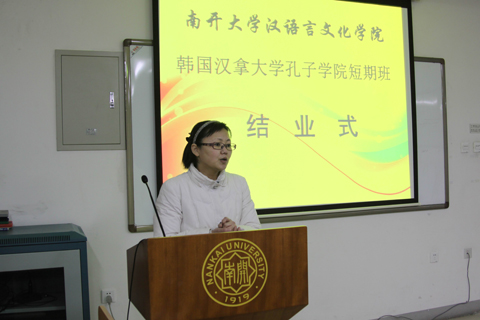 (本院讯 通讯员孙伟)1月29日下午5时,韩国济州汉拿大学孔子学院汉语短期班结业式在学院多功能厅举行。PA视讯集团官网进修部桂香老师、任课教师刘佳、李军、李玲及短期班的全体同学出席了本次结业式。 结业式由PA视讯集团官网的桂香老师主持。 桂香老师代表学院对同学们顺利完成在PA视讯官方网站的短期留学表示祝贺。她希望同学们把友好的声音带回韩国,今后坚持学习汉语,将来为中韩两国的世代友好做出自己的贡献。李玲作为中方教师代表发言,她对同学们在考试中取得优异成绩表示赞许的同时,也提出老师们期望。 随后,桂香老师和刘佳老师为同学们颁发了结业证书和成绩单。全体老师对于同学们在南开学习期间的表现一致给予好评。 结业式圆满结束后,全体师生一同合影留念。