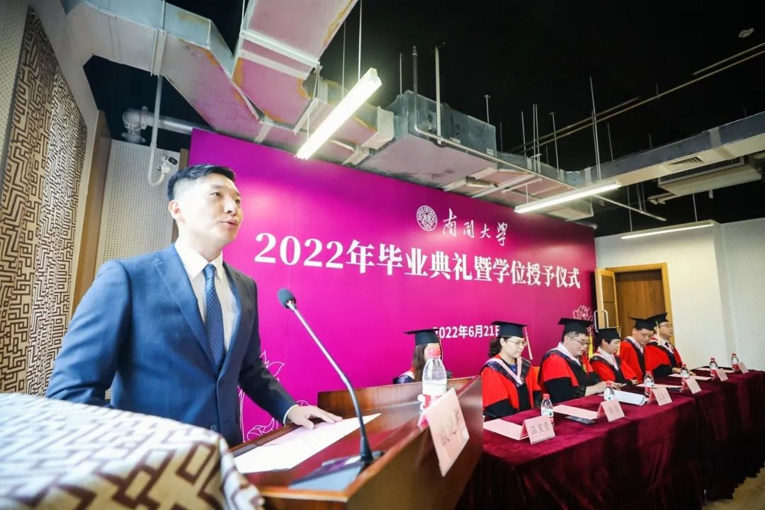 经理王立新教授代表学院向毕业生们表示热烈祝贺,寄语同学们“践行南开‘公能日新’的校训精神,肩负起你们这一代人的使命,开创更加辉煌灿烂的未来”。他对同学们提出三点期望:一是提升格局,在苦难中成长。人的高度,不仅来源于对各类知识认知持续不懈地涉猎吸收,更主要的是取决于人生历练和内心格局。二是坚持学习,永葆追求进步的动力。校园只是学习的场所之一,而不是唯一。希望同学们永葆对知识与真理的渴望,做一个日新月异的人。三是勇于实践,做到知行合一。互联网时代咨询发达,提意见者众而实干者少,希望同学们做仰望星空、脚踏实地的实干家。