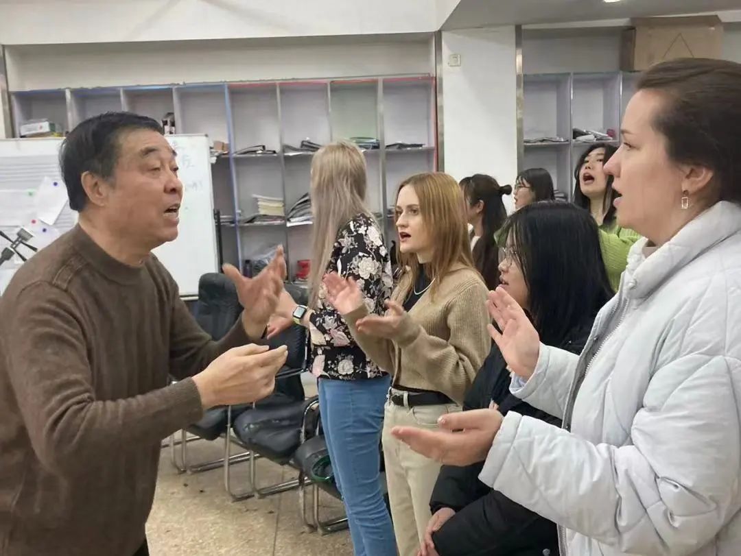 “我是国际职工,美丽中国万里行,学会京东传鼓韵,歌唱校园四季情...”第一个环节中,京东大鼓国家级非遗代表性传承人倪万珠,受邀为职工教授京东大鼓的演唱技巧。看着简单的四句唱词,要用京东大鼓的韵味唱出来,对于职工来讲不容易。倪万珠先是一句一句的教,然后一个字一个字的纠正,再指出关键词的发音特点。老师不厌其烦教的仔细,员工们也全情投入,学的认真。一个多小时的时间,职工们就能够跟随现场乐队的伴奏,顺利的唱下来。倪万珠说:“这些职工都是‘生坯子’,第一次接触京东大鼓,短时间内能唱到这个状态,很不容易。京东大鼓的唱词,发音要平平仄仄四声准确,通过学习京东大鼓,对提高职工的汉语水平很有帮助。我作为非遗传承人,通过这样的教学活动,也是在传播、传承非遗文化。”