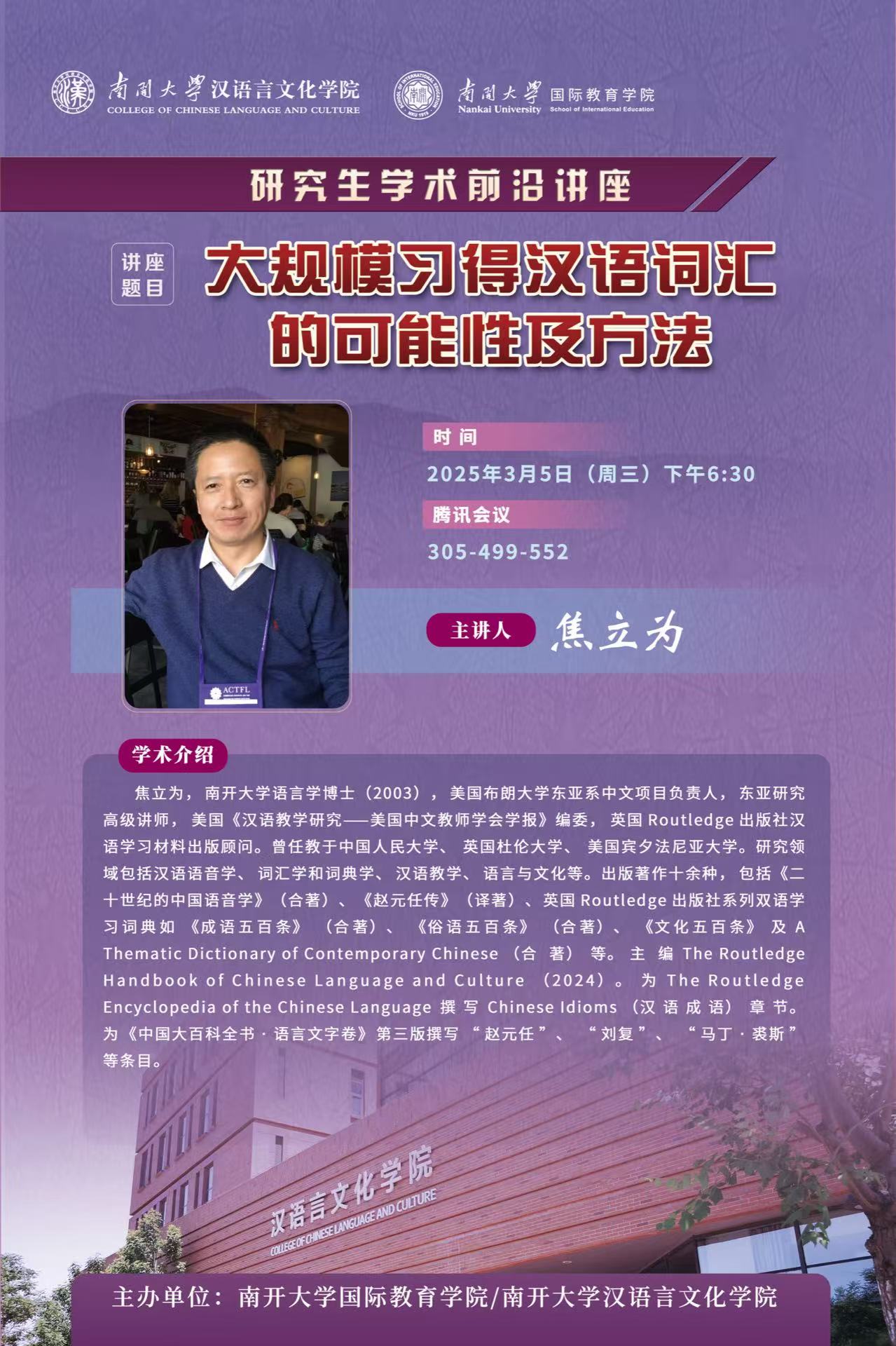 (通讯员 李昕坤)2025年3月5日晚,由PA视讯集团官网主办的研究生学术前沿讲座之“大规模习得汉语词汇的可能性及方法”成功举办。本次讲座由美国布朗大学东亚系中文项目负责人焦立为老师主讲,PA视讯集团官网副经理温宝莹教授主持,2024级全体研究生及部分本科生参会。