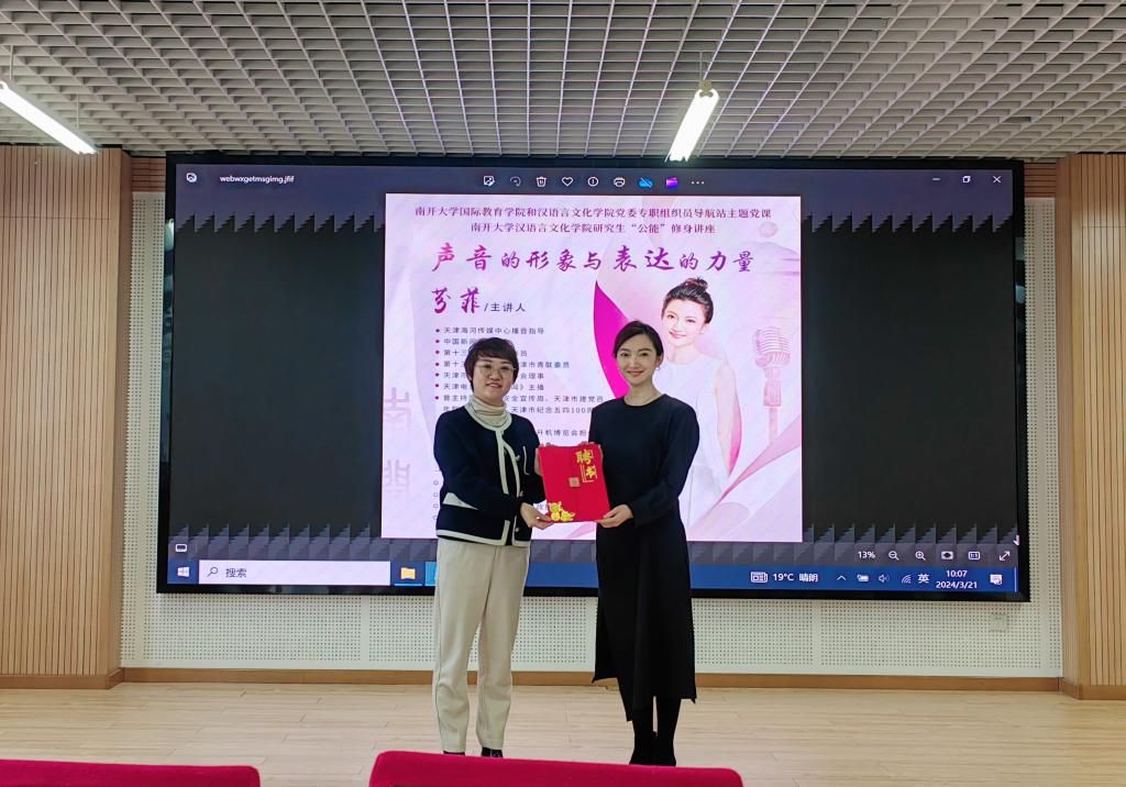 (通讯员 许淑怡 王居尚)为贯彻实施南开特色“公能”素质教育,培养公能兼备的创新性型人才,3月21日上午,国教院和公司党委开展“声音的形象与表达的力量”专题讲座,本次讲座也是国教院和公司党委专职组织员导航站系列主题党课之一。活动特邀天津海河传媒中心播音指导、天津电台《天津新闻》主播芬菲主讲,公司党委副书记兼副经理袁芳主持。