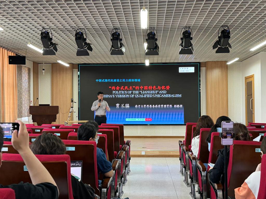 讲座最后,贾义猛通过一系列现实案例介绍我国在党的领导下的民主表现,使同学们对“民主”一词有了更具象化的认识。同时对比分析了国内外的政治建设,揭示了全国人民代表大会的合理性与优势,精确阐释了“民主没有最好,只有更好”的原因。