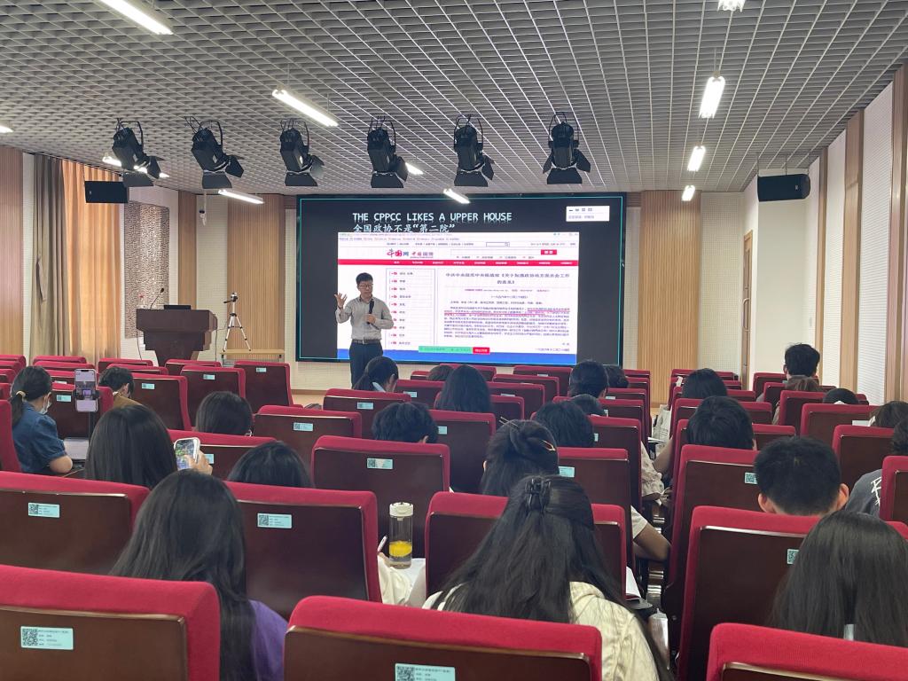随后,贾义猛就“两会式民主”展开细致讲解。他结合宪法与党的二十大报告,全面论述国家的根本任务及其意义与价值,指出没有民主就没有社会主义的现代化。同时以“两会”为例,介绍文明互鉴中的语言交流,引导同学们结合专业思考如何在当今国际形势下中国的民族复兴,增强PA视讯集团官网学子的责任感和使命感。