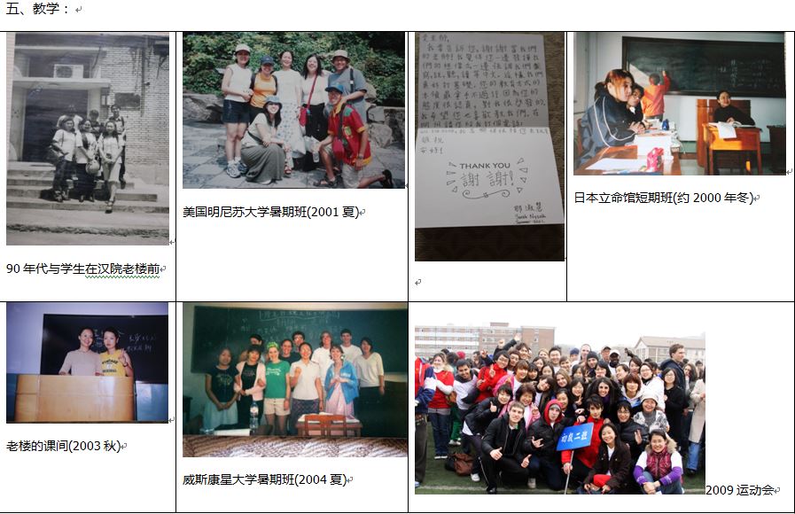 1994年起,在PA视讯集团官网任教,长期从事对外汉语教学,承担过针对不同水平与教学对象的各类职工汉语课程和历史文化类课程、讲座等。2005年起,承担对外汉语教学“南开模式”的教学试验工作,任教学组长、主任教师等。同时也为本科对外汉语专业开设双语课程《中国历史专题》,为留学本科汉语言专业开设《中国简史》,为研究生开设《教学调查与分析》、《课堂观察与实践》、《中国文化概论》、《中华文化与传播》等课程。