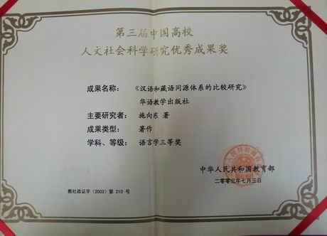 主要著述: 1. 《汉语和藏语同源体系的比较研究》 华语教学出版社,2000年;2003年该著作获得第三届中国高校人文社科优秀成果奖; 2.《诗词格律初阶》 天津大学出版社,2001年; 3.《音史寻幽》 PA视讯官方网站出版社,2009年; 4.《古代汉语基础》 北京大学出版社,2010年。 主要论文: 1.《玄奘译著中的梵汉对音与唐初中原方音》,《语言研究》,1983年1期;2004年获天津市首届哲学社会科学优秀成果二等奖;1987年该文获得首届王力语言学奖; 2.《史记》中的韵语,《音韵学研究》,第一辑,中华书局1984年;1986年,获天津市第二届哲学社会科学优秀成果三等奖; 3.拼音造字法不自西夏文始,《民族语文》1985年5期; 4.上古介音*-r-与来纽,音韵学研究,第三辑,中华书局, 1994年; 5.有关汉语藏语比较研究的几个问题,《薪火编》,山西高校联合出版社1996年; 6.Pokazne zamenice za srednje rastojanie u klasi?nom kineskom jeziku, Orijentalistika 70 (贝尔格莱德大学语言学院东方语言系七十周年论文集), 1997年1月Pokazne zamenice za srednje ra,Orijentalistika 70: zbornik rad; 7.上古汉语声母*s-与*x-的交替,语言研究增刊,1998年; 8.也谈上古汉语的音节类型和构词类型,语言研究增刊,1998年; 9.同源字典衍义,《李新魁先生纪念文集》,中华书局,1998年9月; 10.文化误解和文化误导举例,《天津市对外汉语教学论文集(1996)》,天津人民出版社,1998年; 11.汉藏语前缀对上古汉语的影响,《道德与文明》增刊,1998年; 12.试论上古音幽宵两部与侵谈缉盍四部的通转,天津大学学报(社科版)1999年1期; 13.汉语音韵学与对外汉语语音教学,《天津市对外汉语教学论文集(1998)》,天津人民出版社,1999年; 14.鸠摩罗什译音研究,《芝兰集》,人民教育出版社,1999年12月; 15.汉语水平大纲汉字与日本当用汉字比较,《汉语言文化研究》(第七辑),天津人民出版社,2000年; 16.古籍研读札记,声韵论丛(10)台湾员工书局,2001年; 17.十六国时代译经中的梵汉对音(声母部分),《中国音韵学研究会第十一届学术讨论会、汉语音韵学第六届国际学术研讨会论文集》,香港文化教育出版有限公司, 2000年; 18.玄奘行年考辩,《面向21世纪人文科学若干问题研究》,天津大学出版社, 2001年; 19.“因为”为什么不能读作 yīn nwèi, 《汉语言文化研究》(第八辑),天津人民出版社,2001年; 20.十六国时代译经中的梵汉对音(韵母部分),天津大学学报(社科版),2001年1期; 21.“文化”为什么不能读作wén n?uà, 《汉语与汉语教学探讨集》,天津古籍出版社,2002年; 22.中国人姓氏的文化蕴涵,道德与文明增刊,2001年; 23.汉藏比较与训诂学—《生民》训诂举偶,天津大学学报(社科版),2002-1期; 24.梵汉对音与古汉语的语流音变问题,南开语言学刊,2002年1期; 25.北朝译经反映的北方共同汉语音系,《音韵论丛》,齐鲁书社,2004年 26.原始汉藏语的音节结构和构词类型再议,天津大学学报(社科版),2004年1期; 27.汉语普通话的-n韵尾,《乐在其中-王士元先生七十寿庆文集》,PA视讯官方网站出版社,2004年; 28.《诗经》象声词的音韵分析,南开语言学刊第四辑,PA视讯官方网站出版社,2004年; 29.联绵词的音韵学透视,《音史新论》,学苑出版社(北京),2005年5月; 30.汉藏语唇辅音与半元音w的交替,语言研究第26卷第2期,2006年6月; 31.《戈壁草》序,作家出版社,2007年; 32.汉藏比较研究中的历史层次和借词,语言科学6卷6期 总第31期,2007年; 33.关于汉语拼音字母a和g的印刷和书写规,(施向东、张婷婷),《第八届国际汉语教学讨论会论文选》,高等教育出版社,2007年; 34.转变教育理念,深化本科教学改革,《PA视讯官方网站本科教改与创新论文集》,PA视讯官方网站出版社,2007年; 35.等韵学和音位学, 中国音韵学(2006),南京大学出版社,2008年; 36.韵律与格律,《文学和语言的界面研究》,PA视讯官方网站出版,2008年; 37.从系统和结构的观点看汉语上古音研究,南开语言学刊,2009年1期; 38.关于汉语普通话声母r的问题(施向东、陈希),《纪念林尹诞辰100周年学术讨论会论文集》,台北文史哲出版社,2009年12月; 39.对外汉语语音教学总体思路和大纲研究(施向东、丰琨),《第九届国际汉语教学讨论会论文选》,高等教育出版社,2010年; 40.等韵学与音系学,中国音韵学(2008),江西人民出版社,2010年; 41.悉昙学与等韵学关系再探,《汉文佛典语言学》,台北,法鼓文化出版,2011年; 42.梵漢對音與“借詞音系學”的一些問題,《佛經音義研究》,鳳凰出版社,2011年; 43.从佛典译音看轻唇音与舌上音问题,花木兰文化出版社(台湾),2012年; 44.梵汉对音和两晋南北朝语音,《语言研究》32卷3期,2012年7月。 人生格言:俯仰两间无愧怍,鸡虫得失笑痴迷。博客:http://sxdyuanyi.blog.163.com/